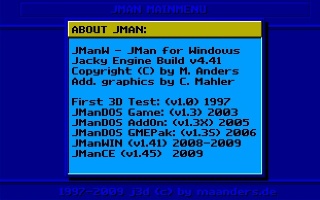 | Die letzte Version von JMan wurde nach Windows konvertiert und auch Dank der Unterstützung von Christoph Mahler grafisch aufgewertet. Die wesentlich bessere Auflösung von 640x480 oder mehr läßt hier mehr Freude aufkommen. JManW wurde für Windows XP/Vista *3 konstruiert. | ||