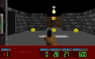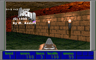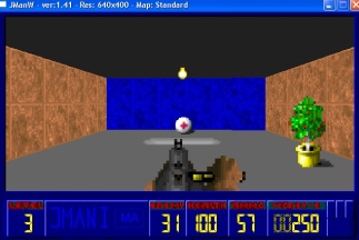 | Die erste JMan Version lief nur auf DOS/Win98 *2 Rechnern und wurde erst 2003 fertig. Die magere Auflösung von 320x200 Pixel war schon zu dieser Zeit 'out', sowie die abgelutschte Wo**ensteinwaffe welche aber zum Testen noch OK war. Das Spiel sollte ein Wo**enstein-Klon werden, jedoch mit einer anderen Story. | ||