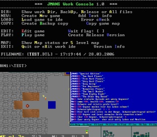| Die alte Entwicklungsumgebung zu JMan. Der level editor JGME 1.7 vereint mit der work konsole (Datei-Managment, Testen, Editieren, Kompremieren,..) Der dazugehörige Level-Editor hat vieles von den klassischen GME bekommen, jedoch um viele Funktionen erweitert. Zwar ist das JMan/KMan Levelformat anders als beim klassischen GME, jedoch wurden einige Details wie "Startpos" oder "word map[4096]" so übernommen. Der alte GME läßt sich gut für eigene Spiele exportieren und anpassen. :) | ||