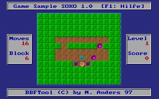 | Die Idee zu diesem Spiel geht weit zurück in das jahr 1996, wo die ersten Ansätze entstanden sind. Das Bild zeigt das Spiel MSOKO aus dem Jahr 1997. Zusammen mit dem Freund Sedat Simsek sind viele Sokoban Varianten entstanden. | ||